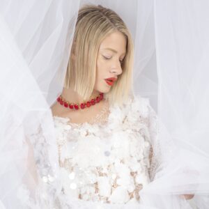 Κολιέ από κόκκινους ακατέργαστους κρυστάλλους με ιδιαίτερη κοπή, ενδιάμεσα επίχρυσα στοιχεία 24K και κούμπωμα με αυξομείωση.
